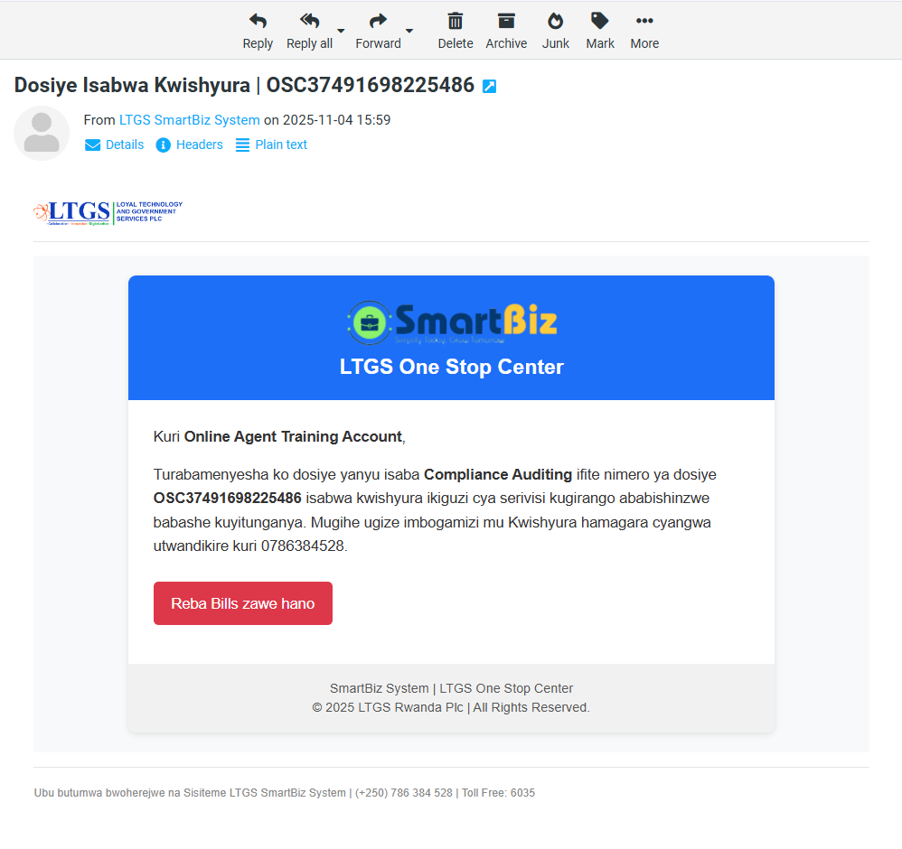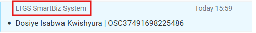 Ubutumwa bwose yaba ubwo kwishyura, kwemeza dosiye, gukosora dosiye bwose bwoherezwa na Sisiteme “LTGS SmartBiz System” nk’Izina ryuwohereje ubutumwa ndetse na imeri notification@lfsg.co.rw