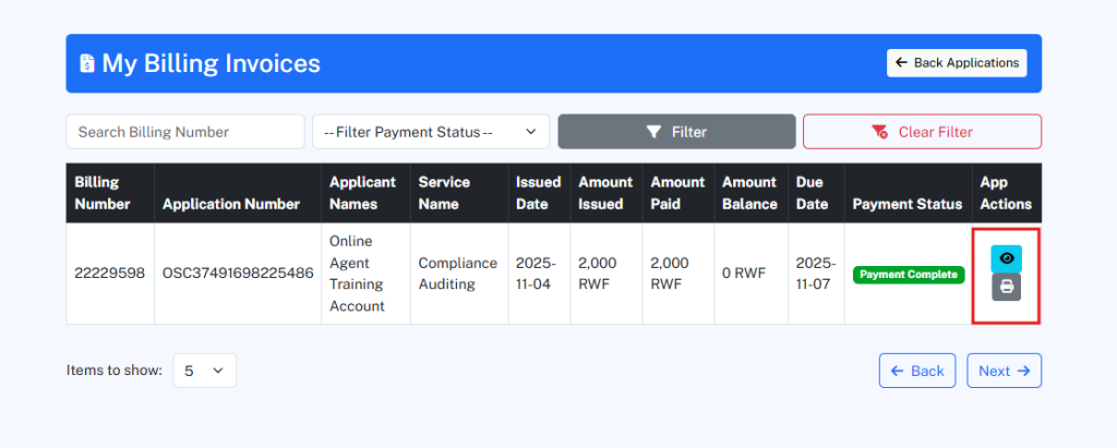 Iyo ushaka kureba amakuru yerekeye bill yawe ndetse no kubona inyemezabwishyu usubira kuri paji iriho urutonde rwa dosiye zisabwa kwishyura maze ukareba kuri icon ziri aho dosiye isoreje;