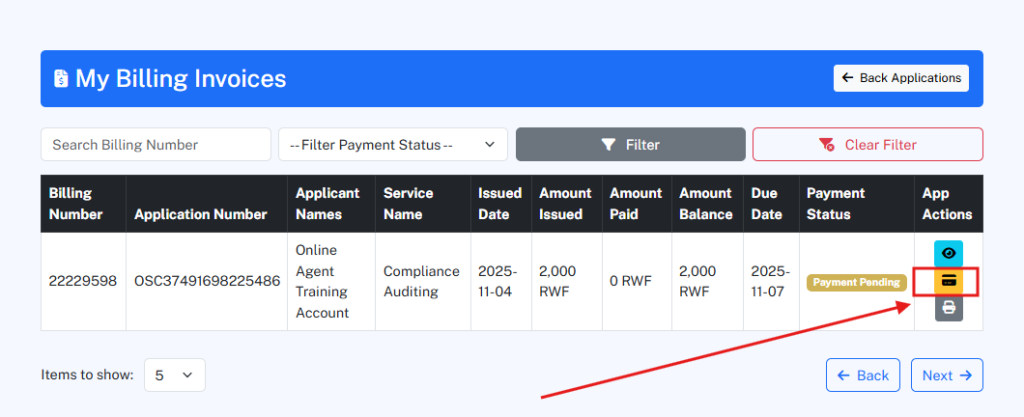 Iyo umaze kugera kuri paji usangaho urutonde rwa dosiye zigomba kwishyurwa, ureba nimero ya dosiye n’izina rya serivisi wasabye hanyuma ukajya kuri icon iri hagati mu zindi icon ifite ibara ry’umuhondo, niho wemeza kugirango wishyure dosiye yawe.