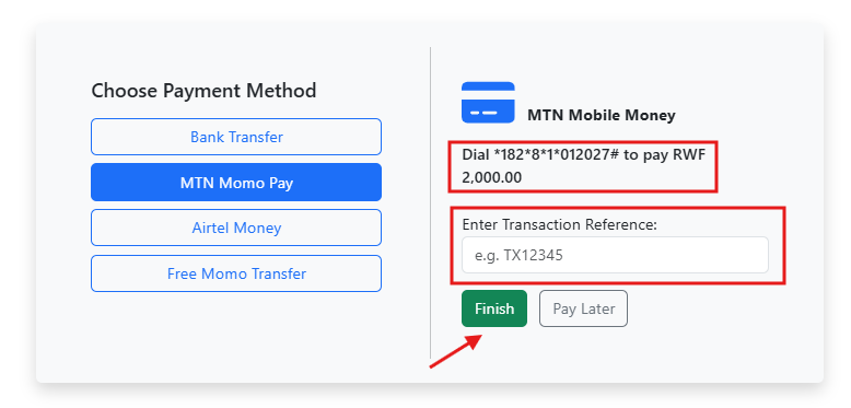 Iyo umaze gufata iyi mibare ariyo TxId cyangwa Transaction ID uyandika aho bakubaza Enter Transaction Reference, maze ukemeza kuri “Finish” iyo ubwishyu bwawe bwakozwe neza kandi nkuko sisiteme ibisaba.
