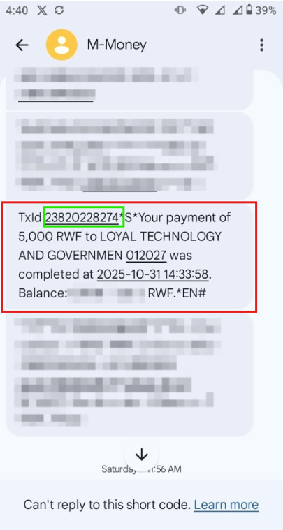 Mugihe uhisemo uburyo ubwaribwo bwose, baguha amabwiriza yo kwishyura ndetse ukanerekwa umubare w’amafaranga usabwa kwishyura, nkuko twahisemo MTN Momo Pay bagusaba gukurikiza amabwiriza yo guhamagara *182*8*1*012027# ni uburyo busanzwe bukoreshwa mu kwishyura na Momo Pay bityo usuzuma neza ko Code ari 012027, ndetse ukandikamo umubare w’amafaranga usabwa hanyuma ukishyura amafaranga akajya kuri LOYAL TECHNOLOGY AND GOVERNMENT, Iyo usoje kwishyura mu butumwa bugufi uhabwa naho wishyuriye (M-Money), haba harimo imibare ariyo TxId niyo usabwa gutanga aho bagusaba “Enter Transaction Reference:”